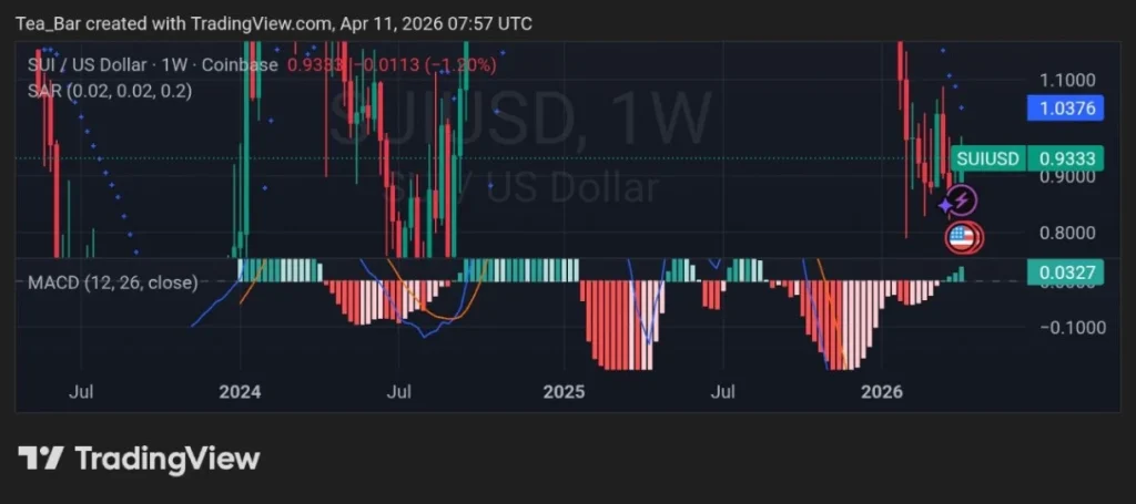 The SUIUSD weekly chart shows price at $0.9333 after a 1.20% decline. MACD (12, 26, close) is positive at +0.0327, signaling building momentum, while the RSI (14) at 33.52 remains oversold.