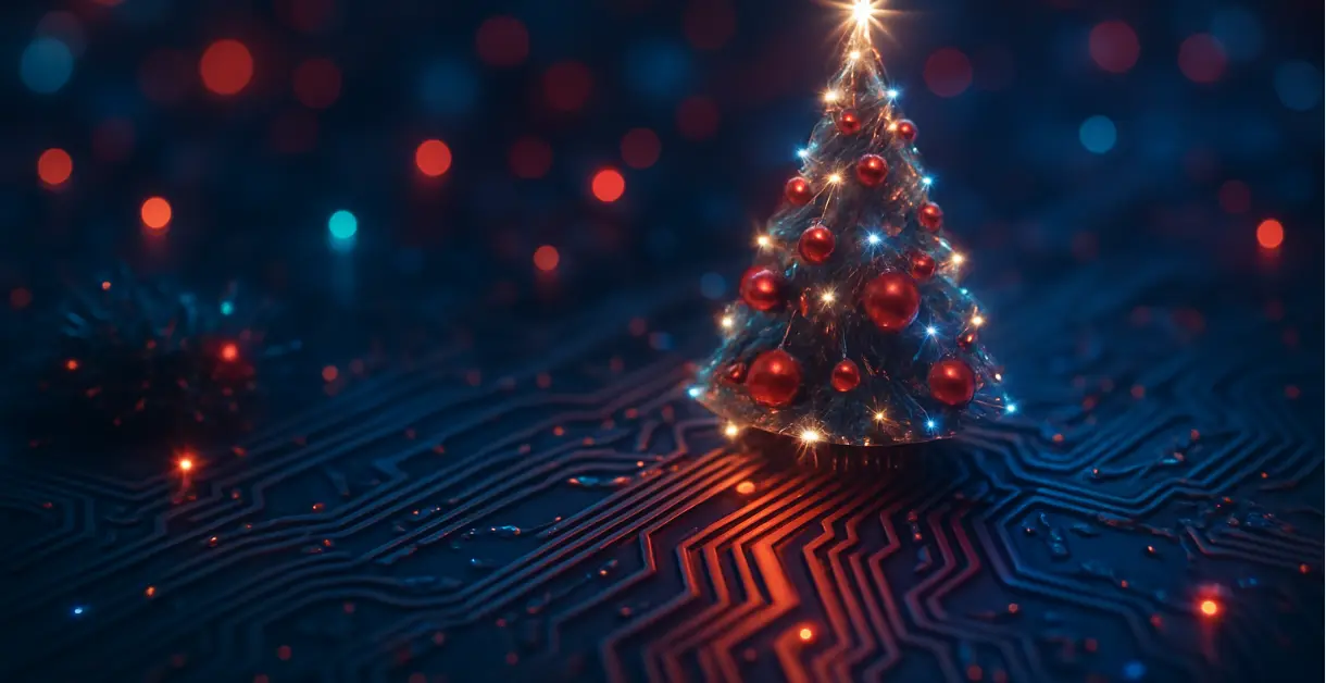 Christmas tree placed on top of a motherboard that represents the merge of AI and Christmas