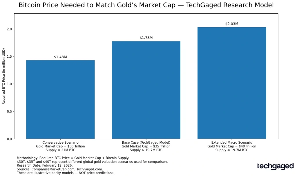 According to TechGaged.com‘s findings, Bitcoin would need to reach approximately $1.78 million per coin under a base-case scenario in which gold’s market capitalization is $35 trillion. The analysis uses a market-cap parity model rather than a price forecast, comparing Bitcoin’s circulating supply against different global gold valuation scenarios.