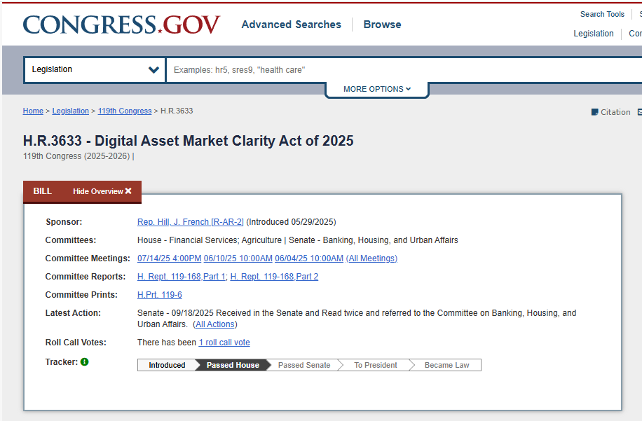 The Digital Asset Market CLARITY Act of 2025 (bill H.R.3633) is a U.S. market-structure bill designed to clarify the line between when a digital asset is treated as a security and when it is treated as a commodity. Moreover, it’s meant to formalize how crypto trading venues and intermediaries register and operate under federal oversight.