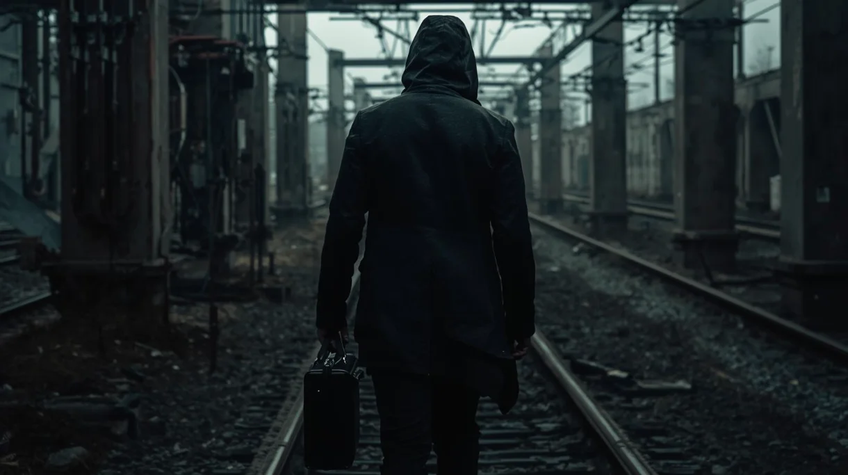 A man in hooded black clothes holding a brief case and walking in a train sub station