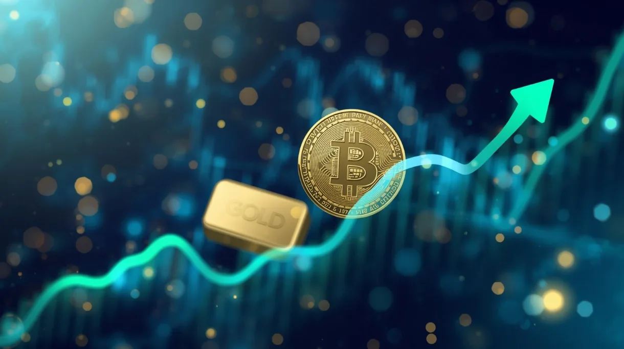 Bitcoin and a gold bar with a green arrow pointing upwards