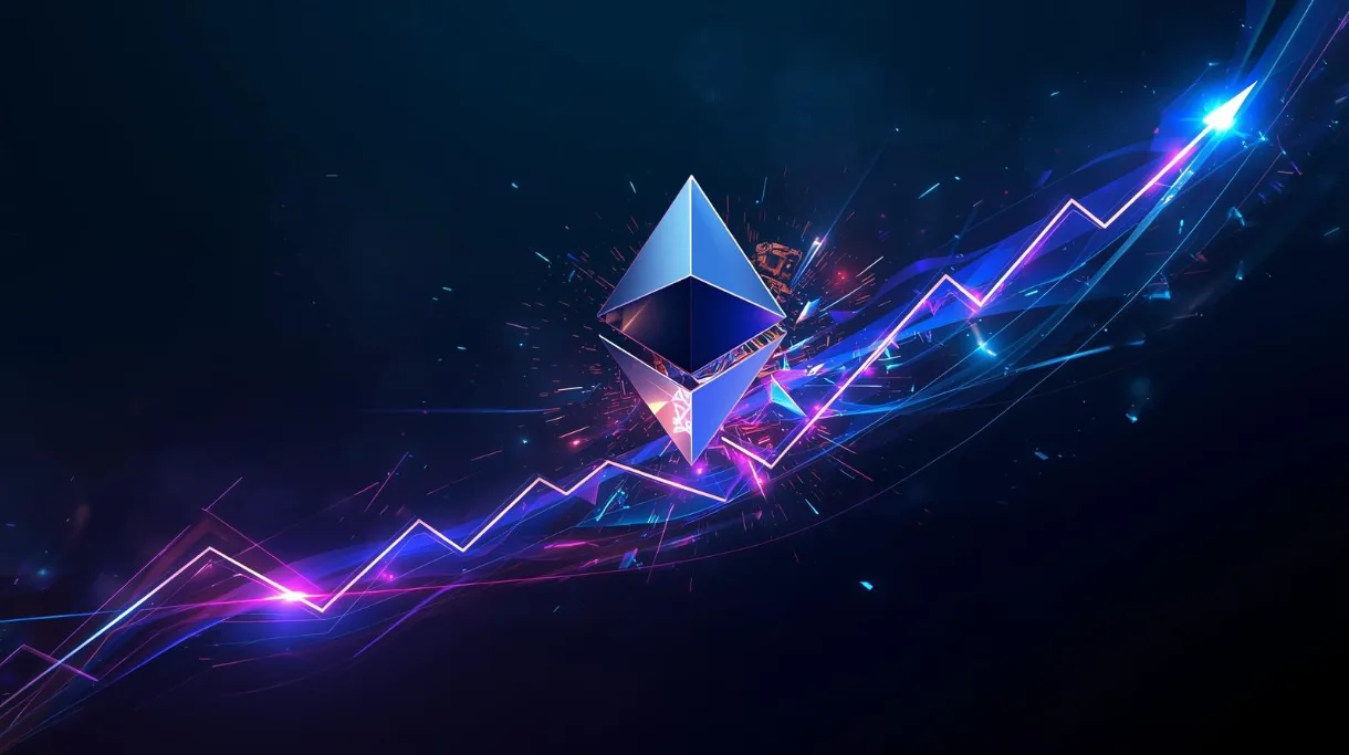 A picture of Ethereum logo on a lightning upward pointing arrow