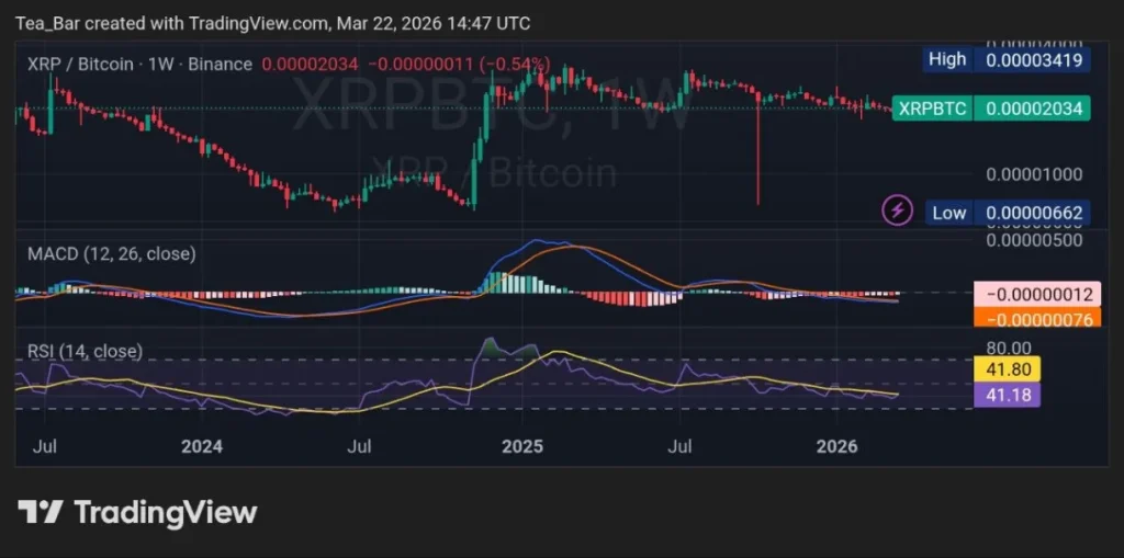 On the XRP/BTC pair at 0.000002034 (-0.54% weekly), the picture is similar but nuanced. RSI sits at 41.18–41.80, less extreme than USD but still below 50, while MACD shows marginal negative values (-0.000000012 / -0.000000076) with flattening momentum.