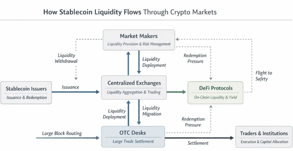 Once minted, stablecoins flow into exchanges, market-making operations, decentralized protocols, and OTC desks.