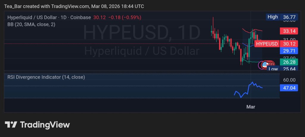 As of March 8, Hyperliquid ($HYPE) trades around $30 as it emerges as a global macro hub amid a weekend oil surge. Momentum remains muted, with the RSI around 47, signaling neutral conditions. Can $HYPE turn this attention into a sustained rally despite mixed market signals?