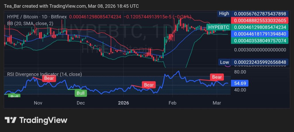 HYPE/BTC is trading at 0.00046129, showing a slight decline as it consolidates near the lower Bollinger Band, a level that often attracts buyers but can also precede further downside.
