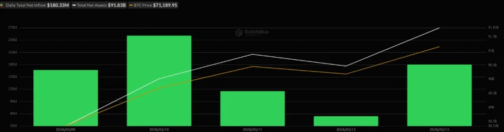 The US BTC spot exchange-traded funds (ETFs) saw the cumulative total net inflow rise to $56.14 billion. Notably, they closed their Friday session in green. As a matter of fact, the entire week was green. The week started with $167.03 million in inflows, and it ended with $180.33 million. The highest amount of positive flows was recorded on Tuesday with $250.92 million.