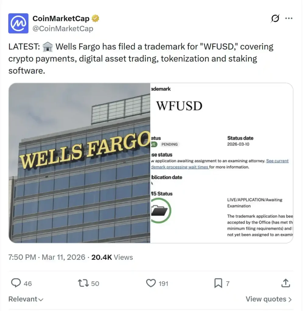 Adoption is also on the rise. Wells Fargo recently filed a U.S. trademark application for “WFUSD,” which covers crypto exchange services, blockchain-based payment verification, lending, staking, tokenization software, and crypto hardware wallets.