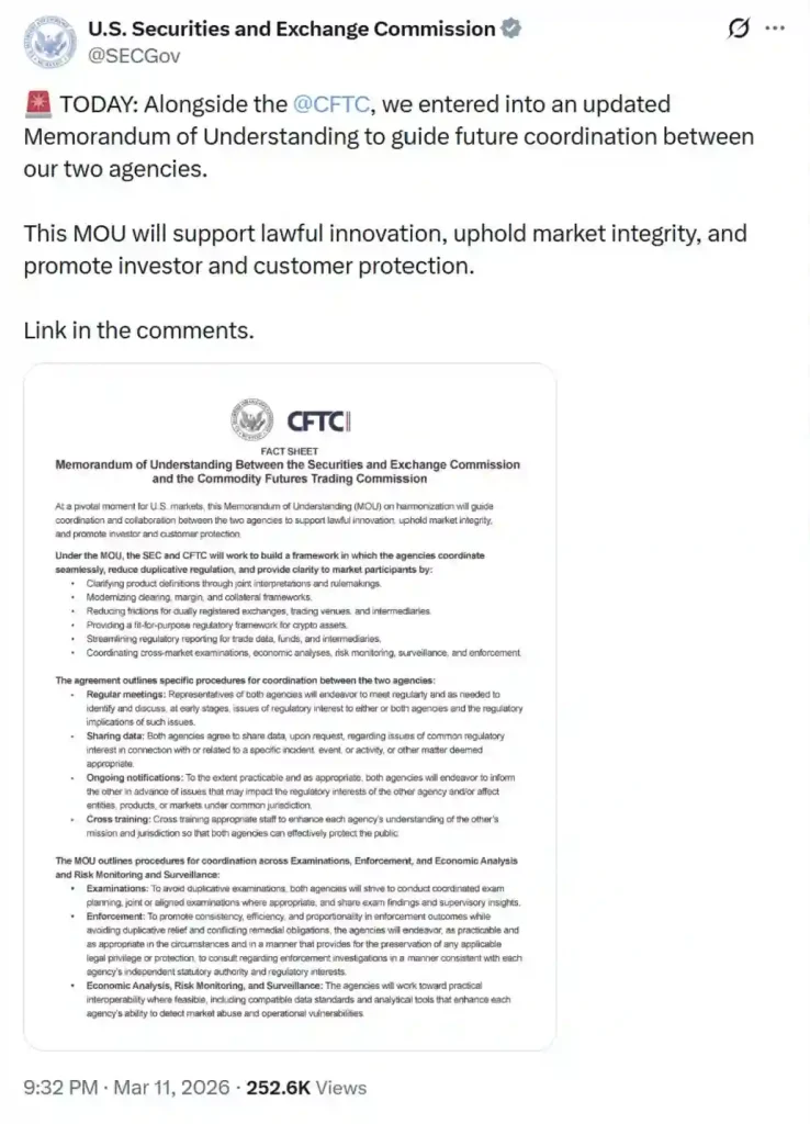 Speaking of regulatory developments, the US Securities and Exchange Commission (SEC) and the Commodity Futures Trading Commission (CFTC) announced a new Memorandum of Understanding to coordinate oversight and modernize how the agencies regulate financial markets, including crypto.