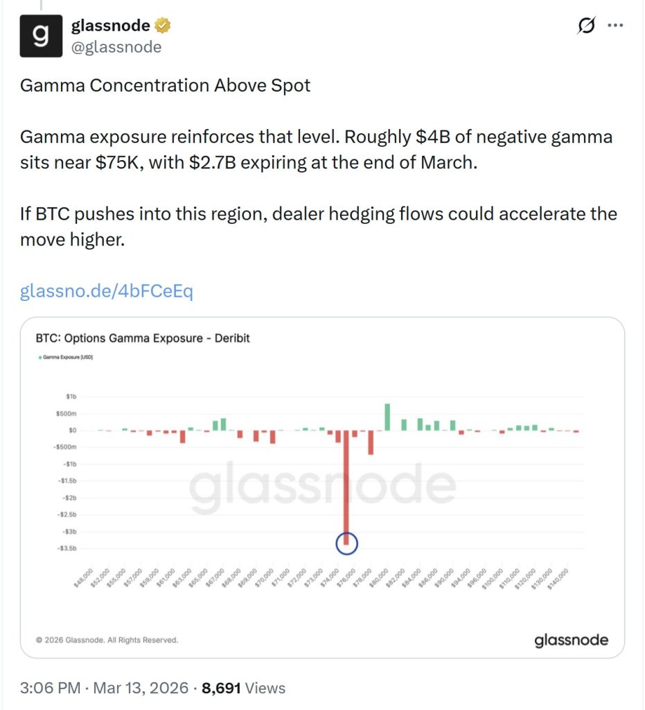 Additionally, key strike formed at $75,000 key strike, “where concentrated call positioning could begin influencing price dynamics,” the analysts argued. They added, however, that by Friday, bullish buying accelerated. Flow in the 24 hours leading to the report leaned to the upside, with the majority of activity being bullish.
