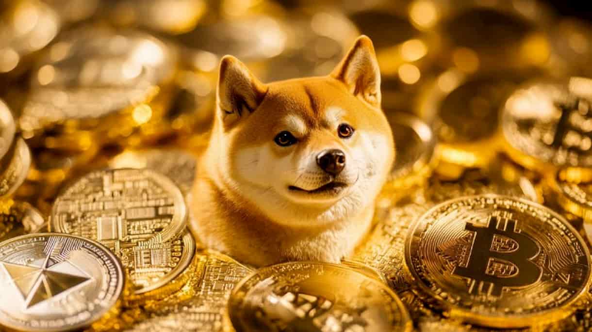 A shiba Inu dog surrounded by crypto coins