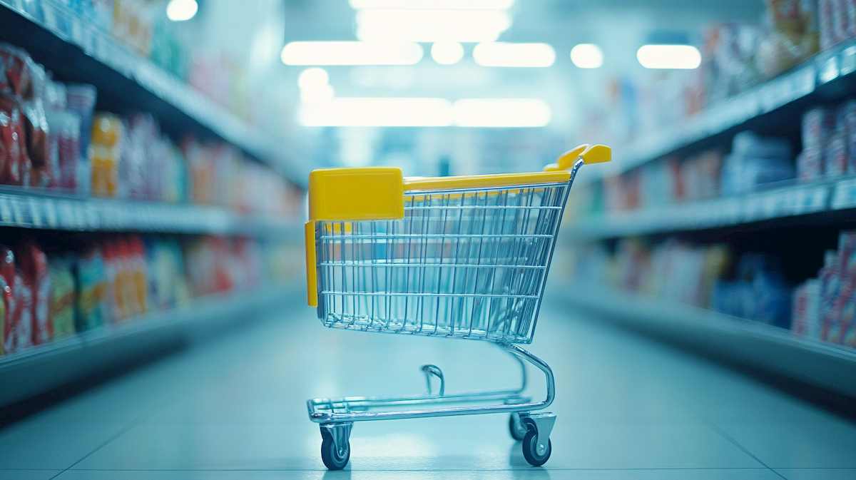 An empty shopping cart in the middle of a store