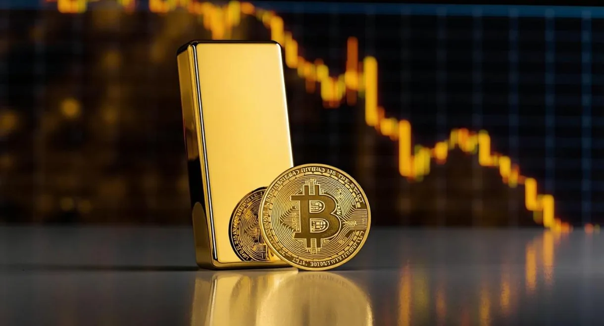 A gold bar standing tall over a Bitcoin