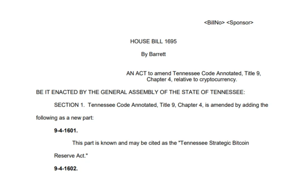 Tennessee State Representative Jody Barrett has introduced House Bill 1695 (HB1695), titled the “Tennessee Strategic Bitcoin Reserve Act”, into the 114th General Assembly.