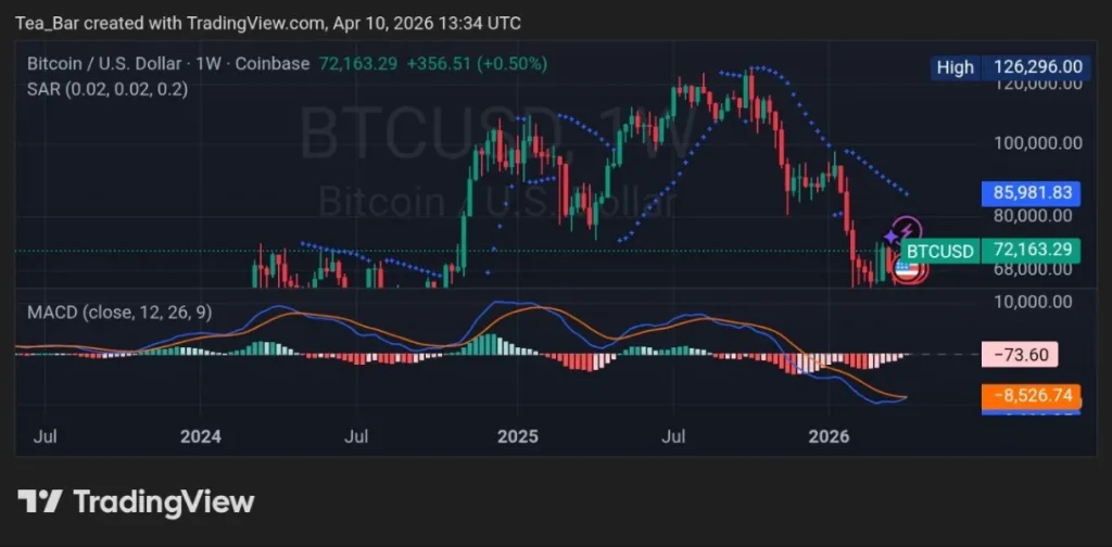 On the BTCUSD weekly chart, timestamped April 10, 2026, 13:34 UTC. Bitcoin trades at $72,163.29 (up 0.50% intraday).