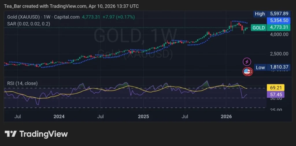 As of April 10, 2026, at 13:37 UTC, the weekly XAUUSD chart paints a bullish masterpiece. Price sits at $4,773.31 (up 0.17%), hugging a multi-month uptrend.