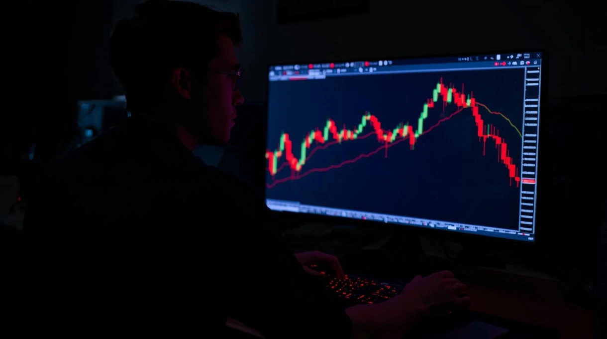A trader in a dark room on a computer with a crashing price chart