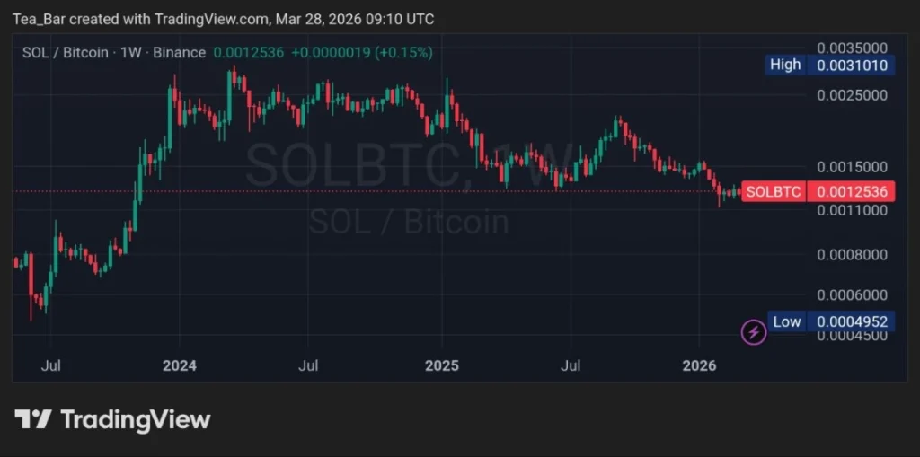 The SOL/BTC weekly chart (Binance) offers an even more telling view. After peaking at 0.0031010 BTC in late 2024, the pair has corrected to 0.0012536 BTC—a 64% drawdown against Bitcoin, a level not seen since early 2024.